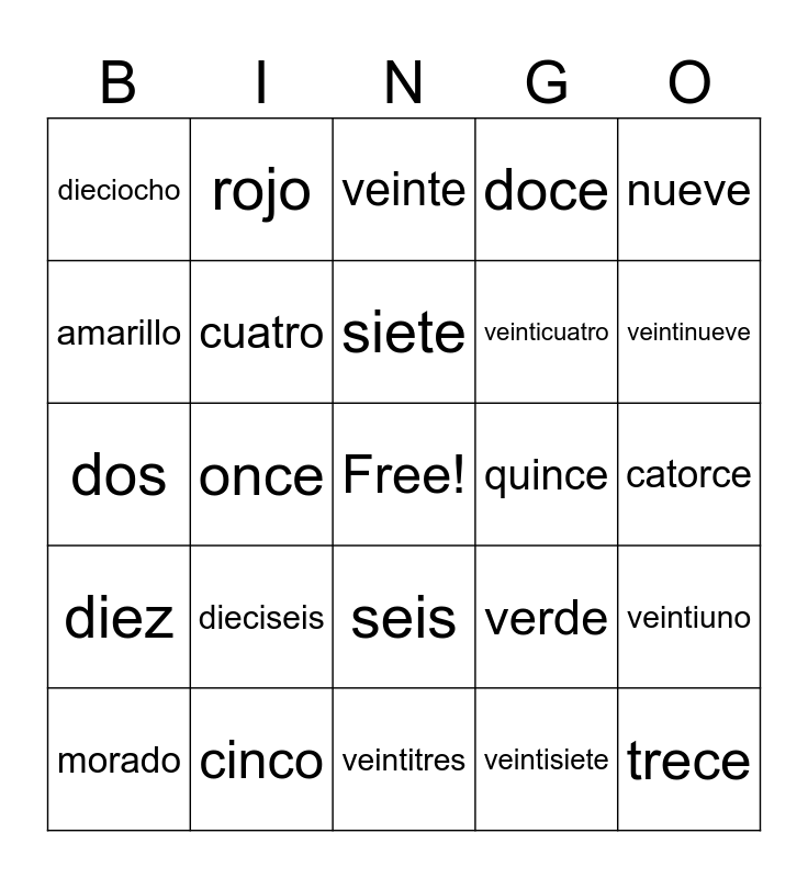 This bingo card has a free space and 41 words: uno, dos, tres, cuatro, cinco, seis, siete, ocho, nueve, diez, once, doce, trece, catorce, quince, dieciseis, diecisiete, dieciocho, diecinueve, veinte, veintiuno, veintidos, veintitres, veinticuatro, veinticinco, veintiseis, veintisiete, veintiocho, veintinueve, treinta, azul, rojo, morado, gris, verde, amarillo, marron, rosado, anaranjado, blanco and negro.