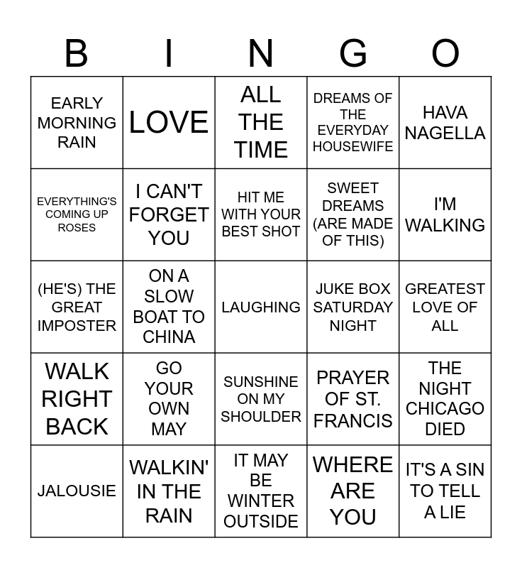 This bingo card has 80 words: AFTER MIDNIGHT, AIN'T SHE SWEET, ALL THE TIME, ASK ME, BACK IN BABY'S ARMS, BAD GIRLS, BALLIN' THE JACK, BUT NOT FOR ME, 'CAUSE I LOVE YOU, COLD AS ICE, CRY MYSELF TO SLEEP, DAY TRIPPER, DREAMS OF THE EVERYDAY HOUSEWIFE, EARLY MORNING RAIN, EL CONDOR PASA, EVERYTHING'S COMING UP ROSES, FRIDAY ON MY MIND, GO YOUR OWN MAY, GOODBYE YELLOW BRICK ROAD, GREATEST LOVE OF ALL, HANDY MAN, HAVA NAGELLA, (HE'S) THE GREAT IMPOSTER, HIT ME WITH YOUR BEST SHOT, I CAN'T FORGET YOU, I LIKE IT, I LIKE IT LIKE THAT, (I WANNA) LOVE MY LIFE AWAY, I WANT TO BE HAPPY, IF I WERE YOUR WOMAN, I'M WALKING, IN THE STILL OF THE NIGHT, IT MAY BE WINTER OUTSIDE, IT'S A SIN TO TELL A LIE, JALOUSIE, JUKE BOX SATURDAY NIGHT, JUST TO BE WITH YOU, KEEM-O-SABE, KOOKIE, KOOKIE (LEND ME YOUR COMB), LAUGHING, LES BICYCLETTES DE BELIZE, LET 'EM IN, LET HER IN, LET'S CALL THE WHOLE THING OFF, LOOK THROUGH ANY WINDOW, LOVE, AQUARIUS/ LET THE SUNSHINE IN, MOODY RIVER, MOON RIVER, MR. WONDERFUL, THE NIGHT CHICAGO DIED, ON A SLOW BOAT TO CHINA, PRAYER OF ST. FRANCIS, SEXY EYES, SILENCE IS GOLDEN, SINCE YOU'VE BEEN GONE, SING, SING, SING, SLIP SLIDIN' AWAY, SOMEBODY LOVES ME, SUNSHINE ON MY SHOULDER, SWEET DREAMS (ARE MADE OF THIS), TAKE ME AS I AM, TELL ME WHY, TEMPTATION EYES, TEQUILA SUNRISE, THAT'S LIFE, THERE GOES MY BABY, THIS DOOR SWINGS BOTH WAYS, THROUGH THE YEARS, TURN BACK THE HANDS OF TIME, WALK RIGHT BACK, WALKIN' IN THE RAIN, WAR, THE WAY WE USED TO BE, WHAT DID I HAVE THAT I DON'T HAVE, WHAT'S HE DOING IN MY WORLD, WHERE ARE YOU, WITH A LITTLE LUCK, YOU ARE MY DESTINY and YOURS.