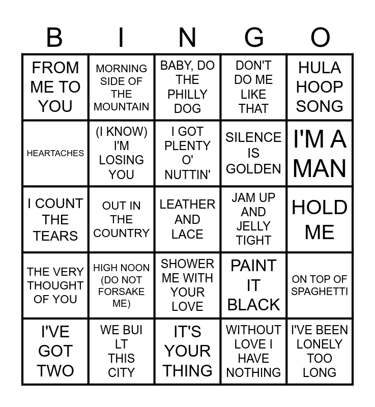 This bingo card has 80 words: 867-5309 (JENNY, JENNY), AFTERNOON DELIGHT, BABY, DO THE PHILLY DOG, BETCHA BY GOLLY, WOW, BEYOND THE BLUE HORIZON, BOTH SIDES NOW, CHARLSTON, COME ON AND SEE ME, DEVIL OR ANGEL, THE DIPSY DOODLE, DO I DO, DO YOU WANT TO FUNK WITH ME, DON'T DO ME LIKE THAT, FROM ME TO YOU, HANKY PANKY, HEARTACHES, Here Comes That Rainy Day Feeling Again, HIGH NOON (DO NOT FORSAKE ME), HIPPY HIPPY SHAKE, HOLD ME, HOLD ME NOW, HULA HOOP SONG, I COUNT THE TEARS, I GOT PLENTY O' NUTTIN', (I KNOW) I'M LOSING YOU, I WANNA BE AROUND, I WAN'NA BE LIKE YOU, I'LL ALWAYS LOVE YOU, I'LL BE AROUND, I'LL NEVER SMILE AGAIN, I'M A MAN, I'M STONE IN LOVE WITH YOU, IT'S YOUR THING, I'VE BEEN LONELY TOO LONG, I'VE GOT TWO, JAM UP AND JELLY TIGHT, JEEPERS CREEPERS, THE JOKER, THE KEEPER OF THE STARS, LEATHER AND LACE, LOVE ME TONIGHT, LOVE POWER, LOVE THE ONE YOUR WITH, MEMORY LANE, MICKEY, MORNING SIDE OF THE MOUNTAIN, NEVER KNEW LOVE LIKE THIS BEFORE, NOTHING'S GONNA STOP US NOW, OH GIRL, OLD FASHIONED LOVE SONG, ON TOP OF SPAGHETTI, OUT IN THE COUNTRY, PAINT IT BLACK, PEG, PEOPLE SAY, RIBBON IN THE SKY, SEASONS IN THE SUN, SHAKE IT OFF, SHE BLINDED ME WITH SILENCE, SHOWER ME WITH YOUR LOVE, SILENCE IS GOLDEN, A TEAR FELL, THEN CAME YOU, THIS I SWEAR, THIS TIME (We're Really Breaking Up), TILL THEN, TIME HAS COME TODAY, TOUCH ME, UNTIL, UP, UP AND AWAY, THE VERY THOUGHT OF YOU, WE BUILT THIS CITY, WHEN WILL I SEE YOU AGAIN, Who's in the Strawberry Patch with Sally, WILD HORSES, WITH A GIRL LIKE YOU, WITHOUT LOVE I HAVE NOTHING, WORKING MY WAY BACK TO YOU BABE, YOU SHOWED ME and YOU'RE MY EVERYTHING.