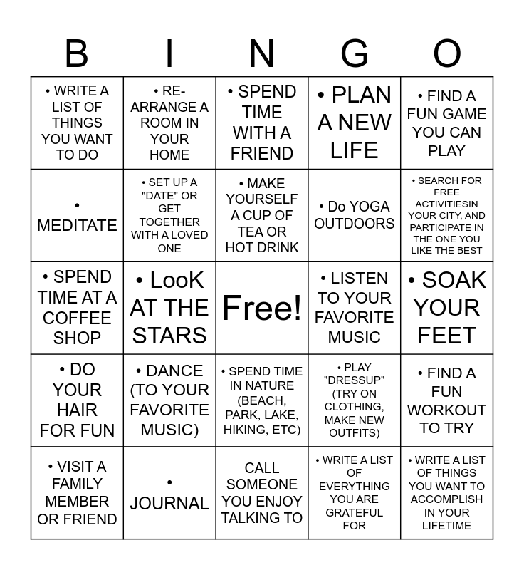 This bingo card has a free space and 45 words: VISIT A LOCAL LIBRARY, • WRITE A LIST OF THINGS YOU WANT TO ACCOMPLISH IN YOUR LIFETIME, • CREATE ART (MUSIC, POETRY, STORIES, PAINTINGS, DRAWINGS, ETC), • VISIT A FAMILY MEMBER OR FRIEND, • MAKE A LIST OF THINGS YOU LIKE ABOUT YOURSELF, • WRITE A LIST OF EVERYTHING YOU ARE GRATEFUL FOR, • SPEND TIME WITH A FRIEND, • FREEWRITE (WRITE DOWN THE FIRST THINGS THAT COME TO YOUR MIND), • FIND A FUN GAME YOU CAN PLAY, • JOURNAL, • PLAN A NEW LIFE, • LISTEN TO YOUR FAVORITE MUSIC, • SPEND TIME IN NATURE (BEACH, PARK, LAKE, HIKING, ETC), • DANCE (TO YOUR FAVORITE MUSIC), • LOOK THROUGH PICTURES AND/OR CREATE A SCRAPBOOK, CALL SOMEONE YOU ENJOY TALKING TO, • READ A GOOD BOOK, • SPEND TIME AT A COFFEE SHOP, • CREATE A VISION BOARD (PUT TOGETHER IMAGES, WORDS & IDEAS THAT REPRESENT HOW YOU WANT YOUR LIFE TO BE IN THE FUTURE), • SEARCH FOR FREE ACTIVITIESIN YOUR CITY, AND PARTICIPATE IN THE ONE YOU LIKE THE BEST, • RE-ARRANGE A ROOM IN YOUR HOME, • SAGE YOUR HOME, • SIT ON A PORCH OR BALCONY, • WRITE A LIST OF THINGS YOU WANT TO DO, • TAKE A RELAXING NAP : WATCH YOUR RAYONNE MOVATIONAL VIDEOS, • SOAK YOUR FEET, • CREATE AN IDEA BOARD (COMPILE TOGETHER IDEAS YOU HAVE ON A BOARD OR LARGE PAPER, • PICK UP AN OLD HOBBY, • PLAY "DRESSUP" (TRY ON CLOTHING, MAKE NEW OUTFITS), • DO YOUR HAIR FOR FUN, • TAKE A WALK, • FIND A FUN WORKOUT TO TRY, • READ INSPIRATIONAL/ MOTIVATIONAL BLOGS, • COLOR (WITH CRAYONS, COLORED PENCILS, ETC.), • TAKE A HOT BUBBLE BATH, • LooK AT THE STARS, • LIGHT A CANDLE OR INSCENT • LISTEN TO A RELAXATION CD OR VIDEO, • COOK YOUR FAVORITE MEAL OR A NEW MEAL, • PAINT YOUR NAILS, • MAKE YOURSELF A CUP OF TEA OR HOT DRINK, • MEDITATE, • Do YOGA OUTDOORS, • PLANT OR GARDEN, • SET UP A "DATE" OR GET TOGETHER WITH A LOVED ONE and • WRITE A LETTER TO SOMEONE YOU LOVE.