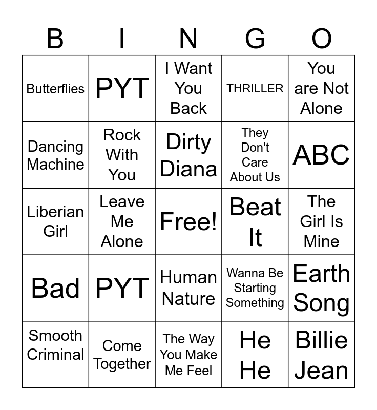 This bingo card has a free space and 24 words: PYT, Come Together, Dirty Diana, Smooth Criminal, You are Not Alone, Butterflies, Dancing Machine, PYT, Beat It, Human Nature, They Don't Care About Us, Liberian Girl, Wanna Be Starting Something, Earth Song, Rock With You, He He, The Girl Is Mine, I Want You Back, ABC, Leave Me Alone, Billie Jean, Bad, THRILLER and The Way You Make Me Feel.