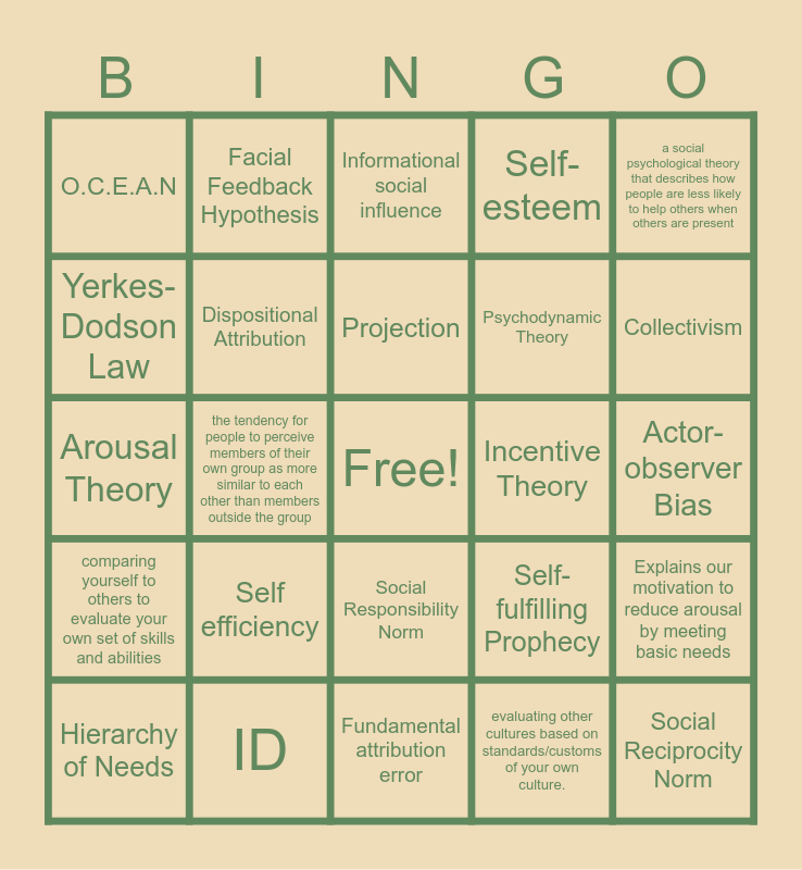 This bingo card has a free space and 24 words: Self efficiency, ID, Projection, Hierarchy of Needs, a social psychological theory that describes how people are less likely to help others when others are present, O.C.E.A.N, Yerkes-Dodson Law, Facial Feedback Hypothesis, Incentive Theory, Social Responsibility Norm, Psychodynamic Theory, Arousal Theory, Self-fulfilling Prophecy, Explains our motivation to reduce arousal by meeting basic needs, Dispositional Attribution, evaluating other cultures based on standards/customs of your own culture., Actor-observer Bias, Informational social influence, Collectivism, the tendency for people to perceive members of their own group as more similar to each other than members outside the group, Social Reciprocity Norm, comparing yourself to others to evaluate your own set of skills and abilities, Self-esteem and Fundamental attribution error.
