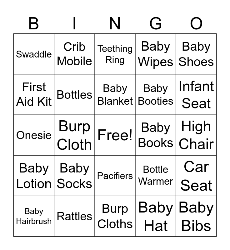 This bingo card has a free space and 40 words: Diapers, Onesie, Stroller, Bottles, Rattles, Pacifiers, Baby Blanket, Crib Sheets, Baby Shoes, Baby Lotion, Burp Cloth, Baby Wipes, Baby Bibs, High Chair, Baby Books, Baby Socks, Baby Monitor, Swaddle, Pacifier Clips, Teething Ring, Car Seat, Baby Hat, Baby Booties, First Aid Kit, Baby Thermometer, Nursing Pillow, Baby Towel, Play Mat, Baby Carrier, Baby Grooming Kit, Baby Washcloths, Baby Hairbrush, Baby Pacifier Holder, Bottle Warmer, Infant Seat, Burp Cloths, Nursing Pads, Baby Shower Card, Crib Mobile and Baby Camera.