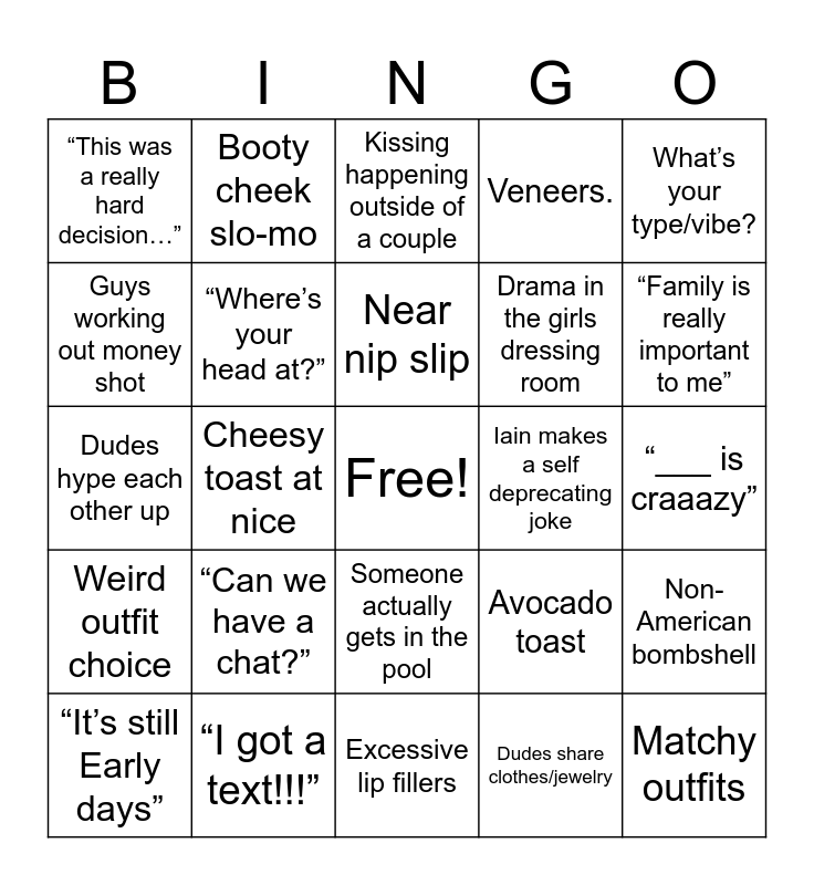 This bingo card has a free space and 24 words: “Can we have a chat?”, “I got a text!!!”, Near nip slip, “It’s still Early days”, What’s your type/vibe?, “This was a really hard decision…”, Guys working out money shot, Booty cheek slo-mo, Iain makes a self deprecating joke, Someone actually gets in the pool, Drama in the girls dressing room, Dudes hype each other up, Avocado toast, Non-American bombshell, “Where’s your head at?”, Dudes share clothes/jewelry, “___ is craaazy”, Kissing happening outside of a couple, “Family is really important to me”, Cheesy toast at nice, Matchy outfits, Weird outfit choice, Veneers. and Excessive lip fillers.