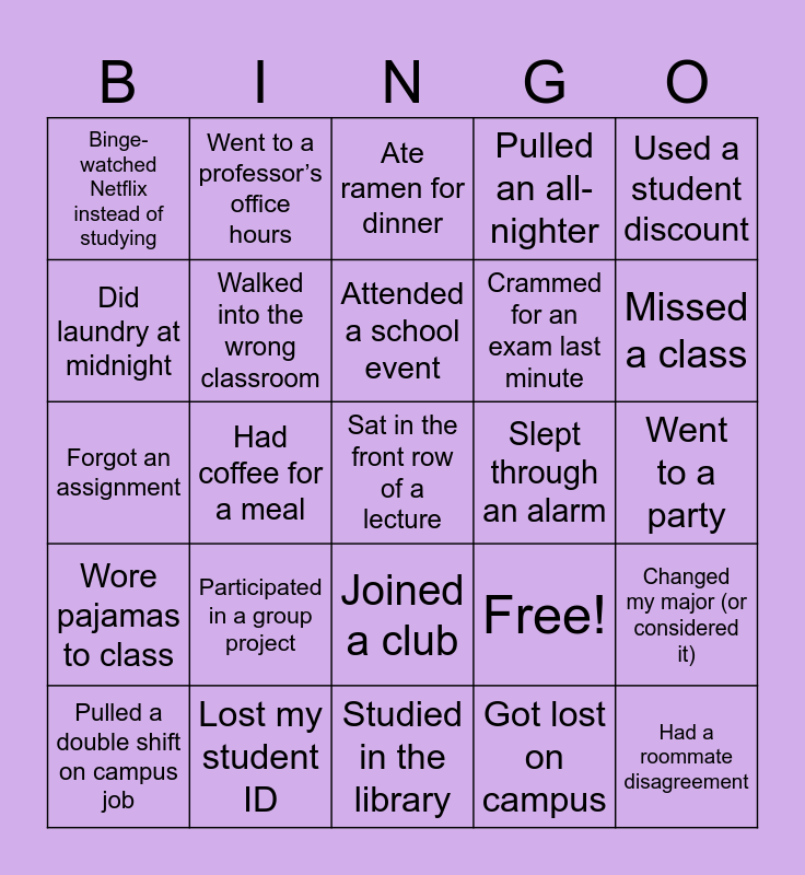 This bingo card has 25 words: Participated in a group project, Studied in the library, Attended a school event, Pulled a double shift on campus job, Used a student discount, Binge-watched Netflix instead of studying, Did laundry at midnight, Went to a professor’s office hours, Slept through an alarm, Joined a club, Crammed for an exam last minute, Forgot an assignment, Free!, Changed my major (or considered it), Walked into the wrong classroom, Had a roommate disagreement, Went to a party, Ate ramen for dinner, Missed a class, Had coffee for a meal, Sat in the front row of a lecture, Lost my student ID, Wore pajamas to class, Pulled an all-nighter and Got lost on campus.