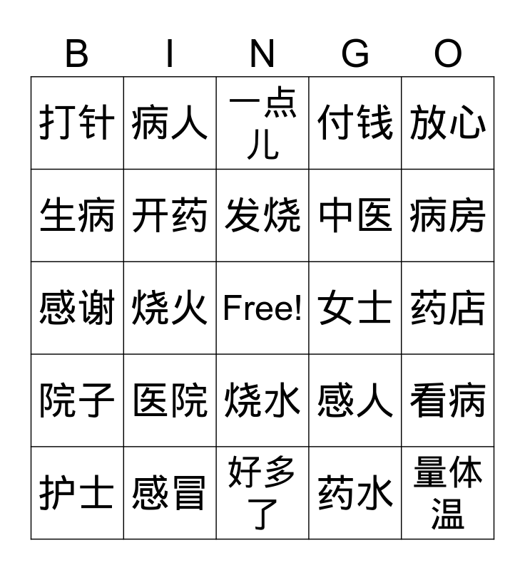 This bingo card has a free space and 24 words: 医院, 感冒, 发烧, 护士, 放心, 打针, 生病, 病人, 女士, 烧水, 中医, 感谢, 感人, 看病, 开药, 药水, 药店, 一点儿, 病房, 烧火, 量体温, 院子, 付钱 and 好多了.