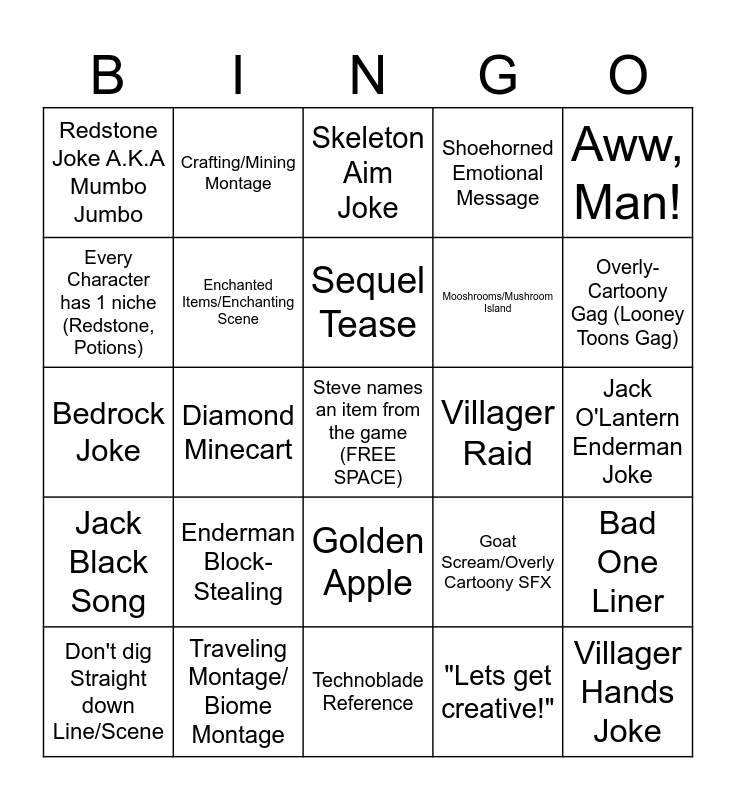 This bingo card has a free space and 24 words: Enderman Block-Stealing, Traveling Montage/ Biome Montage, Sequel Tease, Don't dig Straight down Line/Scene, Aww, Man!, Redstone Joke A.K.A Mumbo Jumbo, Every Character has 1 niche (Redstone, Potions), Crafting/Mining Montage, Villager Raid, Golden Apple, Mooshrooms/Mushroom Island, Bedrock Joke, Goat Scream/Overly Cartoony SFX, Bad One Liner, Enchanted Items/Enchanting Scene, "Lets get creative!", Jack O'Lantern Enderman Joke, Skeleton Aim Joke, Overly-Cartoony Gag (Looney Toons Gag), Diamond Minecart, Villager Hands Joke, Jack Black Song, Shoehorned Emotional Message and Technoblade Reference.