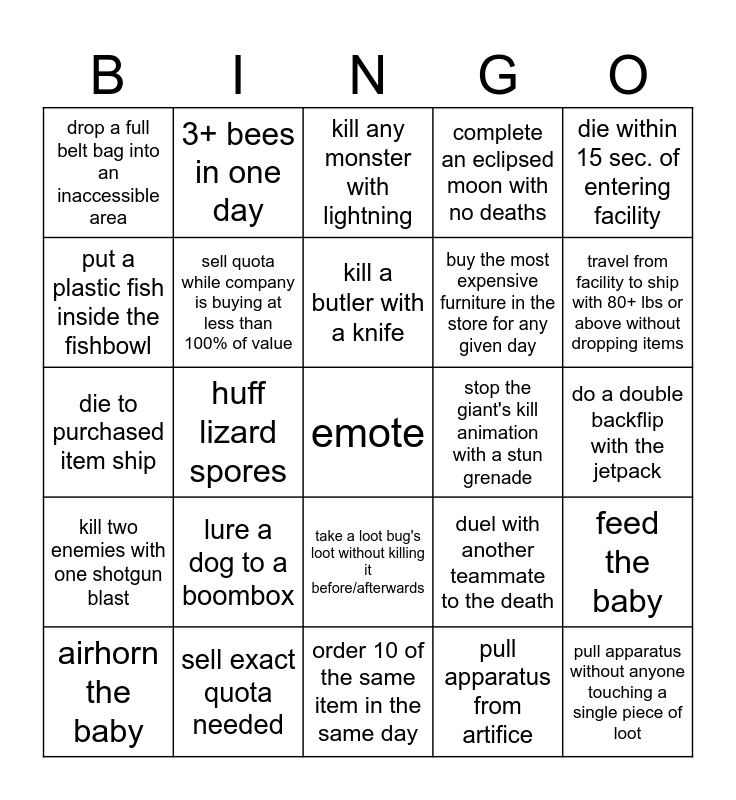 This bingo card has a free space and 24 words: lure a dog to a boombox, sell exact quota needed, kill a butler with a knife, airhorn the baby, die within 15 sec. of entering facility, drop a full belt bag into an inaccessible area, put a plastic fish inside the fishbowl, 3+ bees in one day, stop the giant's kill animation with a stun grenade, take a loot bug's loot without killing it before/afterwards, buy the most expensive furniture in the store for any given day, die to purchased item ship, duel with another teammate to the death, feed the baby, sell quota while company is buying at less than 100% of value, pull apparatus from artifice, do a double backflip with the jetpack, kill any monster with lightning, travel from facility to ship with 80+ lbs or above without dropping items, huff lizard spores, pull apparatus without anyone touching a single piece of loot, kill two enemies with one shotgun blast, complete an eclipsed moon with no deaths and order 10 of the same item in the same day.