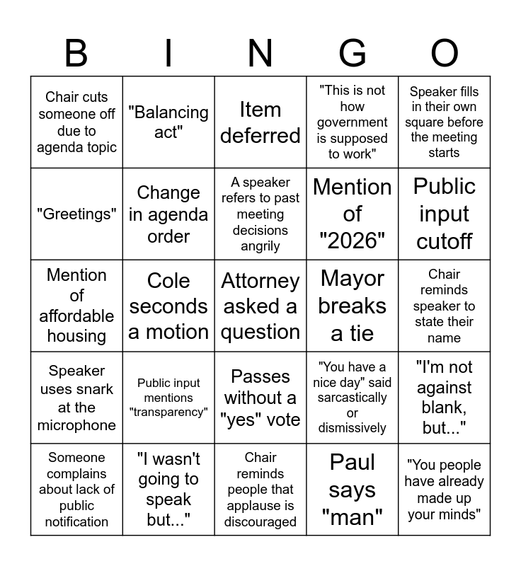 This bingo card has 30 words: "I wasn't going to speak but...", Sierra is present, Cole seconds a motion, Chair cuts someone off due to time, Chair cuts someone off due to agenda topic, Item deferred, Change in agenda order, Passes without a "yes" vote, Mayor breaks a tie, Chair reminds people that applause is discouraged, Chair reminds speaker to state their name, Attorney asked a question, Paul says "man", "You people have already made up your minds", Public input cutoff, Mayor warns public input speaker, "You have a nice day" said sarcastically or dismissively, Speaker uses snark at the microphone, Public input mentions "transparency", Speaker fills in their own square before the meeting starts, Mention of affordable housing, Mayor says, "Man...", "Balancing act", Mention of "2026", "Greetings", "This is not how government is supposed to work", "I'm not against blank, but...", Someone complains about lack of public notification, A speaker refers to past meeting decisions angrily and Awkward silence after a motion is requested.