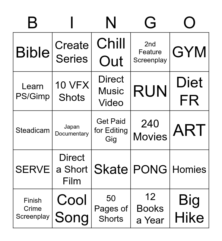 This bingo card has a free space and 24 words: Direct a Short Film, Cool Song, Direct Music Video, Finish Crime Screenplay, GYM, Bible, Learn PS/Gimp, Create Series, 240 Movies, Skate, RUN, Steadicam, PONG, Homies, 10 VFX Shots, 12 Books a Year, ART, Chill Out, Diet FR, Japan Documentary, Big Hike, SERVE, 2nd Feature Screenplay and 50 Pages of Shorts.