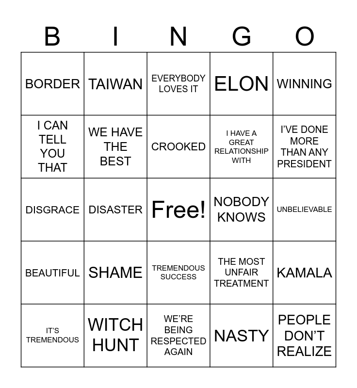 This bingo card has a free space and 125 words: FRANKLY, CHYNUH (CHINA), TREMENDOUS, GREAT, DEI, WOKE, BEAUTIFUL, INCREDIBLE, NASTY, SAD, BIDEN, IRAN, STUPID, RUSSIA, MAGA, RIGGED, WITCH HUNT, UNFAIR, FAKE NEWS, OBAMA, DRILL, BABY, DRILL, DISGRACE, CATASTROPHE, GAZA, PUTIN, CROOKED, ELON, DOGE, ISRAEL, HAMAS, KAMALA, DEAL, DISASTER, SHAME, ZALINSKI, TARIFFS, SANCTIONS, DEMOCRATS, CANADA, MEXICO, BORDER, HUGE, DICTATOR, TREMENDOUS, BELIEVE ME, FAKE NEWS, MAKE AMERICA GREAT AGAIN, WINNING, SAD, LOSER, DISGRACE, BILLIONS AND BILLIONS, INCREDIBLE, DISASTER, WEAK, STUPID, GREAT, TERRIBLE, BEAUTIFUL, NOBODY KNOWS, I CAN TELL YOU THAT, WE'RE LOOKING INTO IT, PEOPLE TELL ME, WE'LL SEE WHAT HAPPENS, TOTAL DISASTER, RIGGED SYSTEM, WITCH HUNT, TREMENDOUS SUCCESS, THE LIKES OF WHICH, UNBELIEVABLE, YOU'RE FIRED, I HAVE TO SAY, NO COLLUSION, ENEMY OF THE PEOPLE, LOCK HER UP, BUILD THE WALL, DRAIN THE SWAMP, AMERICA FIRST, ANTIFA, JANUARY 6TH, MARK MY WORDS, A LOT OF PEOPLE DON'T KNOW THAT, TOUGH GUY, IT’S TREMENDOUS, WE HAVE THE BEST, A TOTAL JOKE, RADICAL LEFT, ECONOMY, PATHETIC, THE BEST PEOPLE, DEEP STATE, NOBODY THOUGHT IT WAS POSSIBLE, WE'RE WINNING SO MUCH, WE’RE DOING THINGS NOBODY THOUGHT POSSIBLE, EVERYBODY LOVES IT, WE’RE BEING RESPECTED AGAIN, SOME PEOPLE SAY, I HEAR IT ALL THE TIME, THEY DON’T WANT YOU TO KNOW, PEOPLE DON’T REALIZE, IT’S ABSOLUTELY TRUE, THE MOST UNFAIR TREATMENT, MANY PEOPLE, THEY DON’T WANT TO REPORT IT, A COMPLETE MESS, THE MEDIA WON’T TELL YOU, THE BIGGEST EVER, I’VE DONE MORE THAN ANY PRESIDENT, WE LOVE OUR COUNTRY, SHOULDA NEVER HAPPENED, CORRUPT MEDIA, YOU WON'T BELIEVE THIS, A TOTAL DISGRACE, I GUARANTEE IT, WE’RE WORKING ON IT, WE'RE TURNING IT AROUND, A LOT OF LOVE, WE HAD A PERFECT CALL, VERY UNFAIR TO ME, I HAVE A GREAT RELATIONSHIP WITH, I’VE BEEN SAYING THIS FOR YEARS, CARTELS, ILLEGALS, TAIWAN and HOSTAGES.