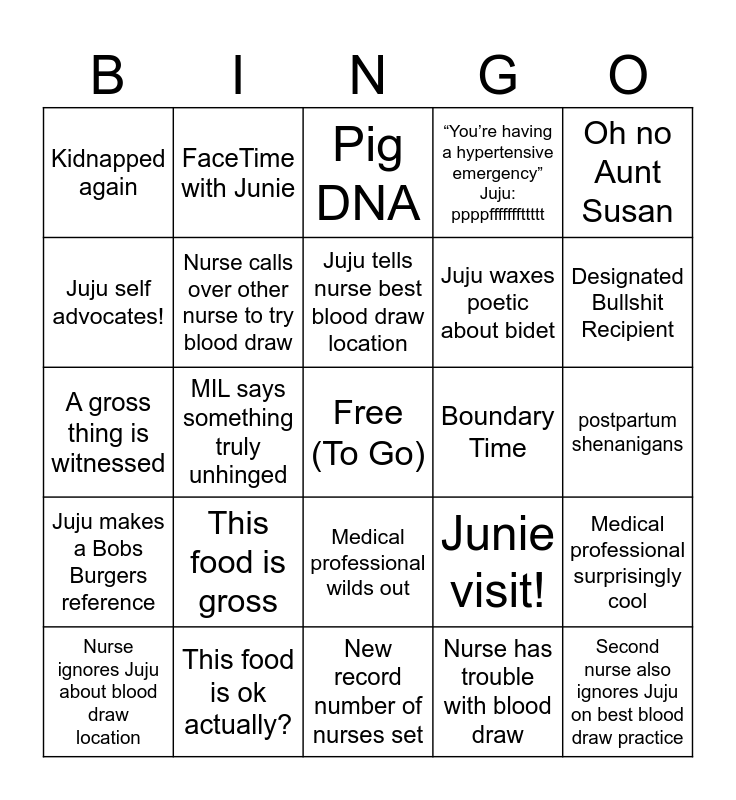 This bingo card has a free space and 24 words: This food is gross, This food is ok actually?, Juju tells nurse best blood draw location, Nurse ignores Juju about blood draw location, Oh no Aunt Susan, Kidnapped again, Juju self advocates!, FaceTime with Junie, Boundary Time, Medical professional wilds out, Juju waxes poetic about bidet, A gross thing is witnessed, Junie visit!, Medical professional surprisingly cool, Nurse calls over other nurse to try blood draw, Nurse has trouble with blood draw, postpartum shenanigans, Pig DNA, Designated Bullshit Recipient, MIL says something truly unhinged, Second nurse also ignores Juju on best blood draw practice, Juju makes a Bobs Burgers reference, “You’re having a hypertensive emergency” Juju: ppppfffffffttttt and New record number of nurses set.
