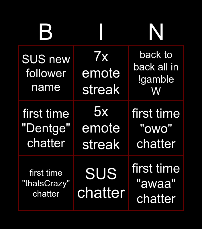 This bingo card has a free space and 8 words: first time "owo" chatter, back to back all in !gamble W, 7x emote streak, first time "thatsCrazy" chatter, SUS new follower name, first time "awaa" chatter, first time "Dentge" chatter and SUS chatter.