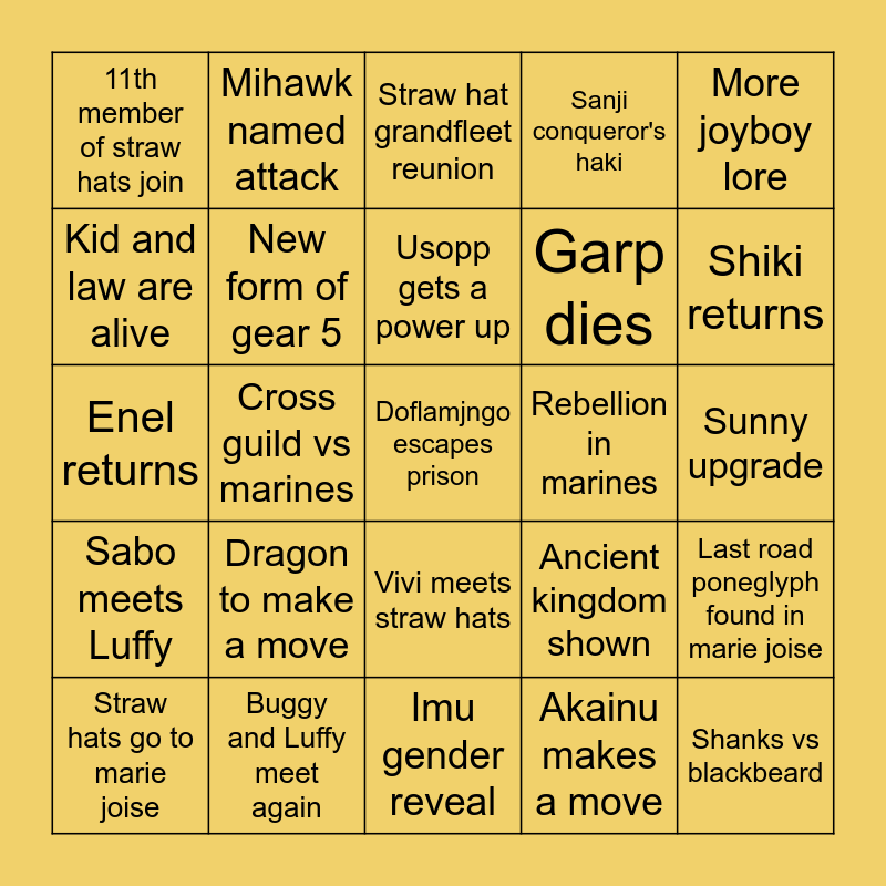 This bingo card has a free space and 24 words: Dragon to make a move, Buggy and Luffy meet again, Usopp gets a power up, Straw hats go to marie joise, More joyboy lore, 11th member of straw hats join, Kid and law are alive, Mihawk named attack, Rebellion in marines, Vivi meets straw hats, Garp dies, Enel returns, Ancient kingdom shown, Last road poneglyph found in marie joise, New form of gear 5, Akainu makes a move, Sunny upgrade, Straw hat grandfleet reunion, Shiki returns, Cross guild vs marines, Shanks vs blackbeard, Sabo meets Luffy, Sanji conqueror's haki and Imu gender reveal.