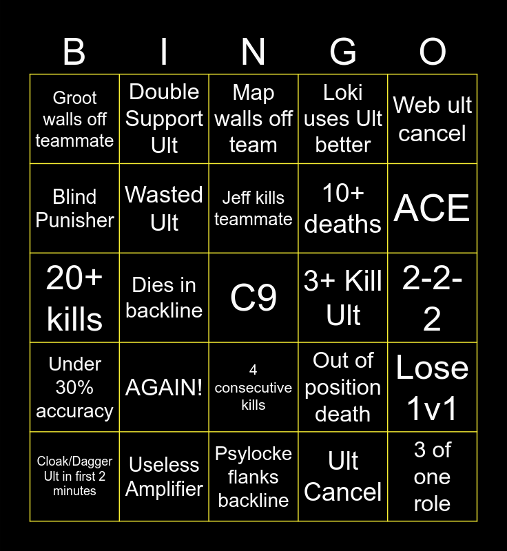 This bingo card has a free space and 24 words: AGAIN!, Useless Amplifier, Jeff kills teammate, Cloak/Dagger Ult in first 2 minutes, Web ult cancel, Groot walls off teammate, Blind Punisher, Double Support Ult, 3+ Kill Ult, 4 consecutive kills, 10+ deaths, 20+ kills, Out of position death, Lose 1v1, Wasted Ult, Ult Cancel, 2-2-2, Map walls off team, ACE, Dies in backline, 3 of one role, Under 30% accuracy, Loki uses Ult better and Psylocke flanks backline.
