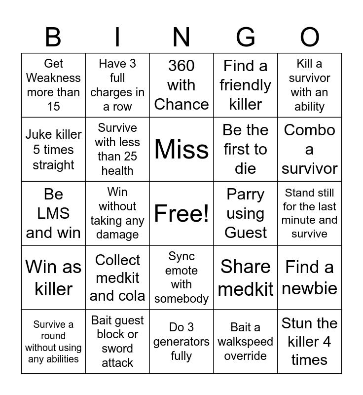 This bingo card has a free space and 24 words: Survive a round without using any abilities, Collect medkit and cola, Miss, Bait a walkspeed override, Kill a survivor with an ability, Get Weakness more than 15, Have 3 full charges in a row, 360 with Chance, Parry using Guest, Stand still for the last minute and survive, Be LMS and win, Survive with less than 25 health, Share medkit, Find a newbie, Juke killer 5 times straight, Bait guest block or sword attack, Do 3 generators fully, Find a friendly killer, Combo a survivor, Win as killer, Win without taking any damage, Sync emote with somebody, Be the first to die and Stun the killer 4 times.