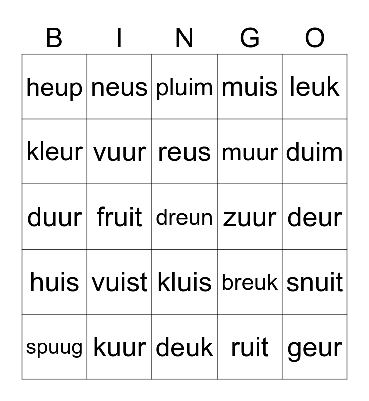 This bingo card has a free space and 24 words: spuug, vuist, reus, ruit, leuk, heup, neus, pluim, zuur, deur, duur, vuur, breuk, snuit, kleur, kuur, deuk, muis, duim, huis, fruit, kluis, muur and geur.