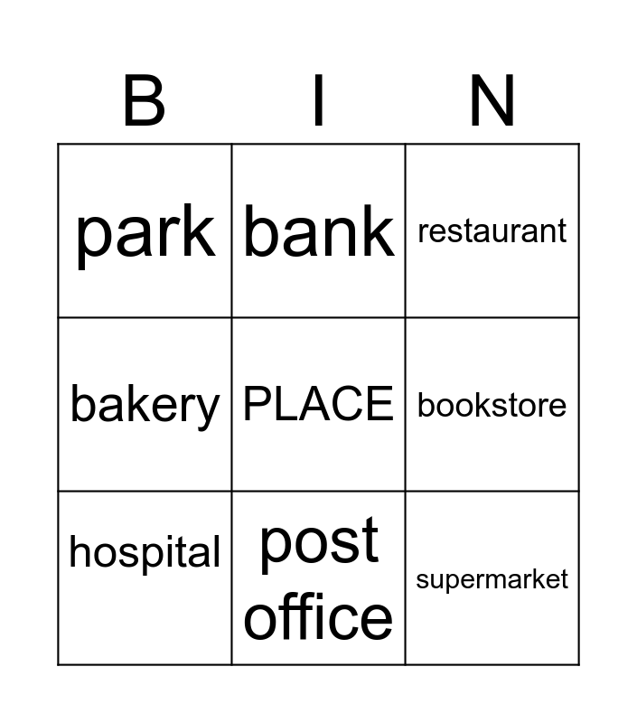 This bingo card has a free space and 8 words: bakery, bank, bookstore, hospital, restaurant, park, post office and supermarket.