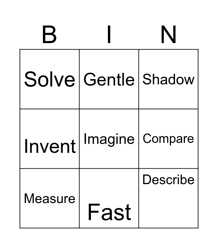 This bingo card has a free space and 8 words: Compare, Shadow, Gentle, Measure, Solve, Describe, Invent and Fast.