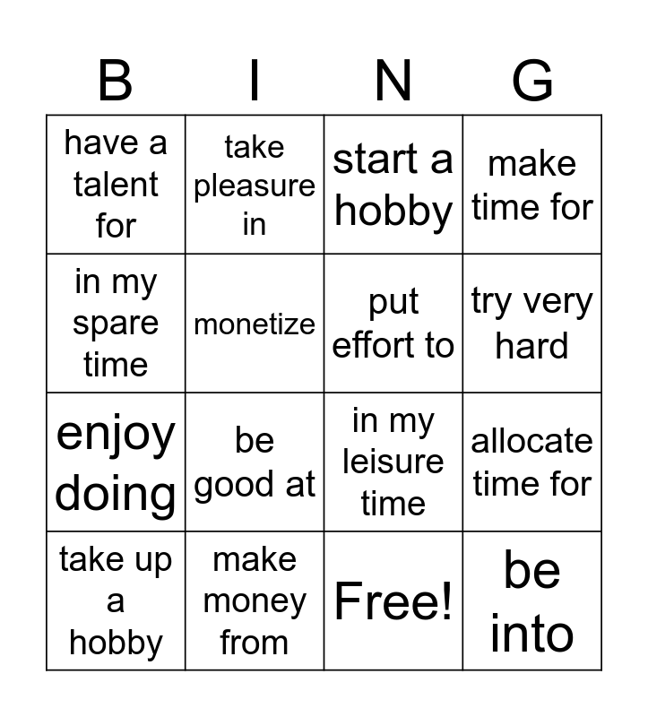 This bingo card has 17 words: Free!, take up a hobby, start a hobby, have a talent for, be good at, make time for, allocate time for, put effort to, try very hard, monetize, make money from, in my leisure time, in my spare time, take pleasure in, enjoy doing, be passionate about and be into.
