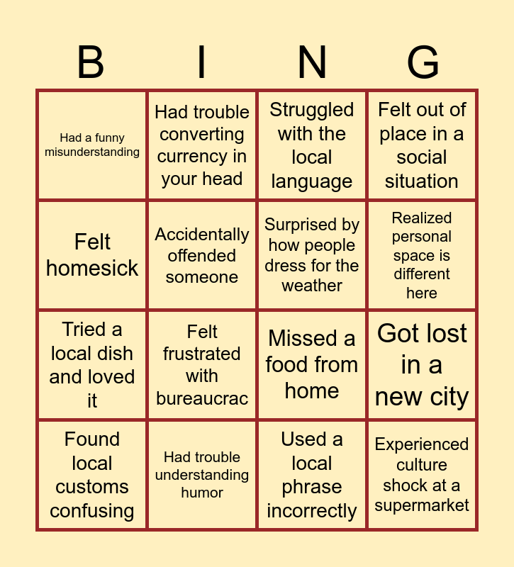 This bingo card has 20 words: Got lost in a new city, Tried a local dish and hated it, Struggled with the local language, Used gestures to communicate, Found local customs confusing, Felt homesick, Had trouble understanding humor, Had a funny misunderstanding, Tried a local dish and loved it, Had trouble converting currency in your head, Felt frustrated with bureaucrac, Missed a food from home, Accidentally offended someone, Experienced culture shock at a supermarket, Surprised by how people dress for the weather, Struggled with local transportation, Realized personal space is different here, Felt out of place in a social situation, Used a local phrase incorrectly and Surprised by meal times.