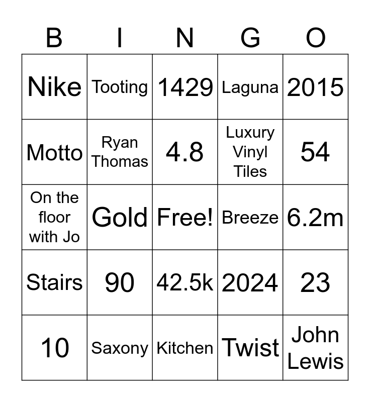 This bingo card has a free space and 24 words: 90, Saxony, 4.8, 10, 2015, Nike, Motto, Tooting, Breeze, 42.5k, Luxury Vinyl Tiles, On the floor with Jo, 2024, 23, Ryan Thomas, Twist, 6.2m, 1429, 54, Gold, John Lewis, Stairs, Laguna and Kitchen.