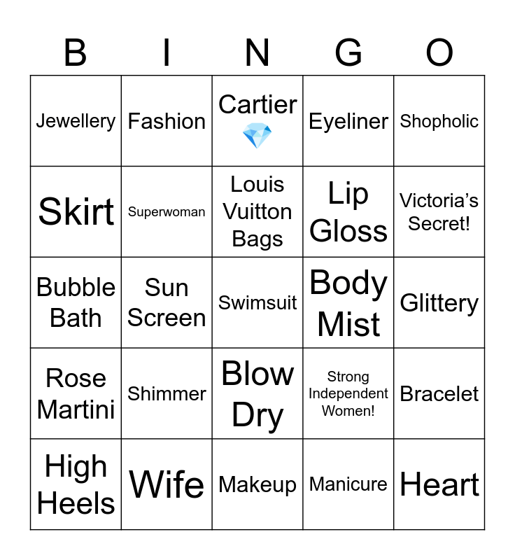This bingo card has 71 words: Free!, Fashion, Pink, Lipstick, Makeup, Blusher, Eyeliner, Mascara, Lip Gloss, Lip Palm, High Heels, Sandals, Victoria’s Secret!, Jewellery, Diamond Ring, Bubble Bath, Strong Independent Women!, Shopholic, Dress, Glittery, Shimmer, Swimsuit, Bracelet, Necklace, Earring, Dancing Suit, Multi-tasker, Horrible Driver!, Mother, Sister, Wife, Daughter, Romance, Kill’em with Kindness!, Manicure, Pedicure, Disney Princesses, Queen, Skirt, Babyliss, Blow Dry, Heart, Rose Martini, Ladies night out!, Feminine Power, Snow White, Cindrella, Superwoman, Catwoman, Nail Polish, Rose, Pony Tail, Body Mist, Body Lotion, Botox, Grandmother, Louis Vuitton Bags, Dior😍, Boots, Goddess, Lady, Beach Bag, Sun Screen, Tan Oil, Ballerina, Model, Cartier💎, Vanilla, Hair Bun, Wedding Dress and Princess.