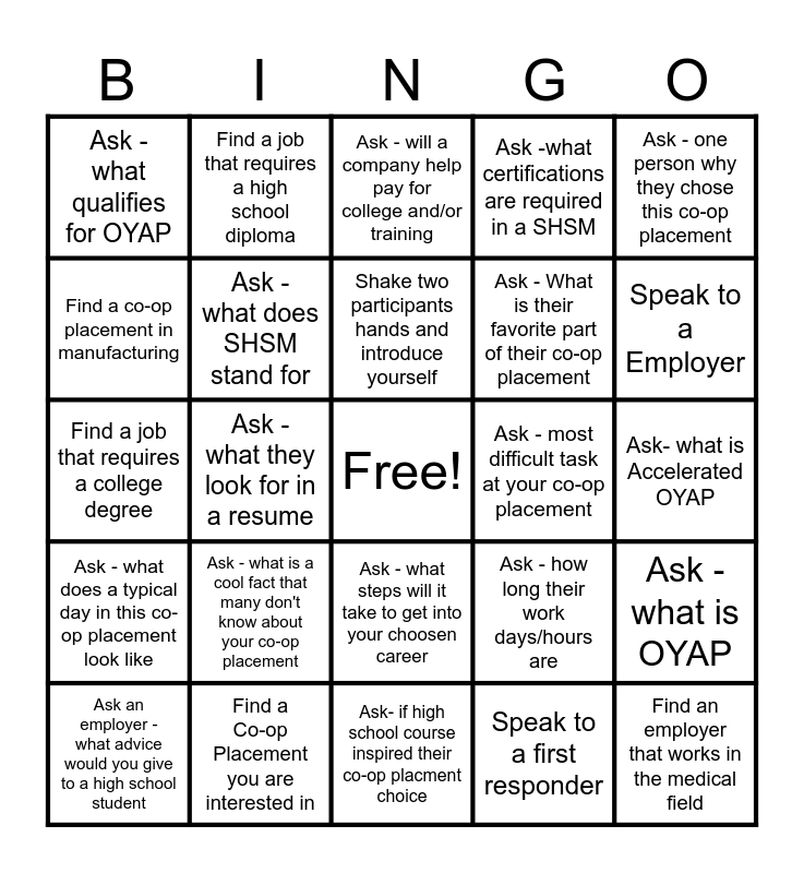 This bingo card has a free space and 24 words: Ask - what is a cool fact that many don't know about your co-op placement, Find a Co-op Placement you are interested in, Shake two participants hands and introduce yourself, Ask an employer - what advice would you give to a high school student, Ask - one person why they chose this co-op placement, Ask - what qualifies for OYAP, Find a co-op placement in manufacturing, Find a job that requires a high school diploma, Ask - most difficult task at your co-op placement, Ask - what steps will it take to get into your choosen career, Ask - What is their favorite part of their co-op placement, Find a job that requires a college degree, Ask - how long their work days/hours are, Ask - what is OYAP, Ask - what does SHSM stand for, Speak to a first responder, Ask- what is Accelerated OYAP, Ask - will a company help pay for college and/or training, Speak to a Employer, Ask - what they look for in a resume, Find an employer that works in the medical field, Ask - what does a typical day in this co-op placement look like, Ask -what certifications are required in a SHSM and Ask- if high school course inspired their co-op placment choice.