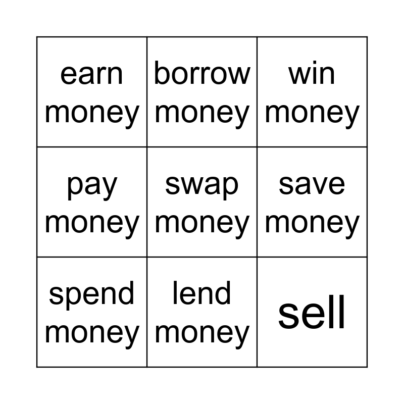 This bingo card has 9 words: spend money, win money, borrow money, pay money, earn money, save money, swap money, sell and lend money.