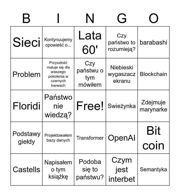 This bingo card has a free space and 24 words: Projektowałem bazy danych, Napisałem o tym książkę, Czy państwu o tym mówiłem, Castells, barabashi, Sieci, Problem, Kontynuujemy opowieść o..., Swieżynka, Transformer, Niebieski wygaszacz ekranu, Floridi, OpenAI, Bit coin, Przyszłość maluje się dla waszego pokolenia w czarnych barwach, Czym jest interbet, Zdejmuje marynarke, Lata 60', Blockchain, Państwo nie wiedzą?, Semantyka, Podstawy giełdy, Czy państwo to rozumieją? and Podoba się to państwu?.