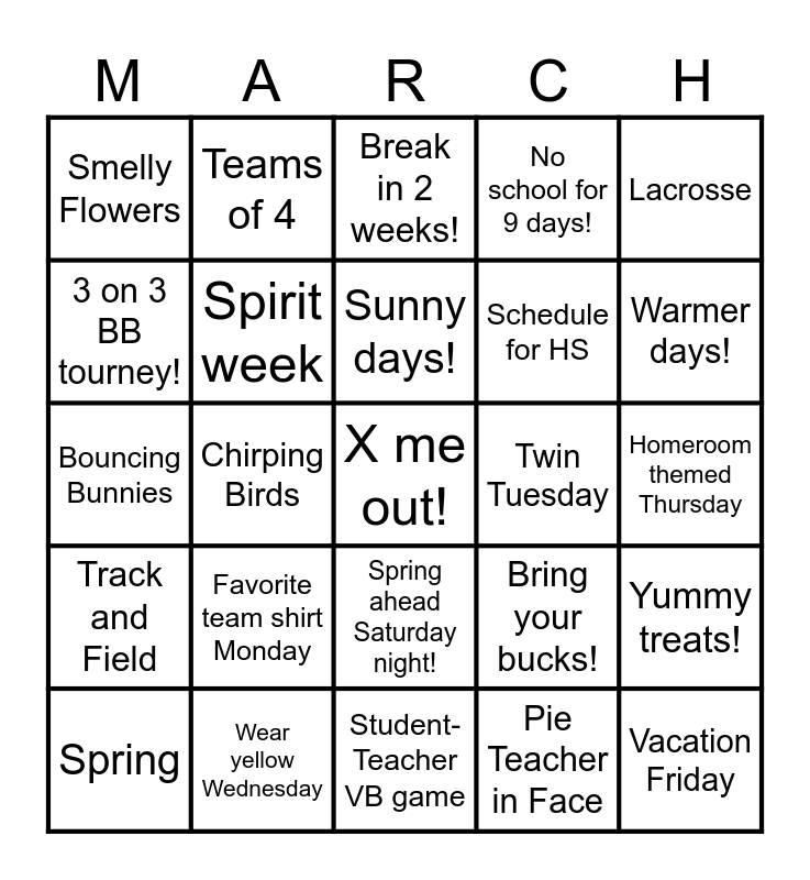 This bingo card has a free space and 29 words: Spring, Basketball, Chirping Birds, Green Grass, Smelly Flowers, Break in 2 weeks!, Spirit week, Favorite team shirt Monday, Twin Tuesday, Wear yellow Wednesday, Homeroom themed Thursday, Vacation Friday, Student-Teacher VB game, Pie Teacher in Face, Warmer days!, Longer Days!, Spring ahead Saturday night!, Track and Field, Lacrosse, Bouncing Bunnies, Bring your bucks!, March Madness!, Schedule for HS, 3 on 3 BB tourney!, No school for 9 days!, Teams of 4, Yummy treats!, Sunny days! and In like a lion; out like a lamb.
