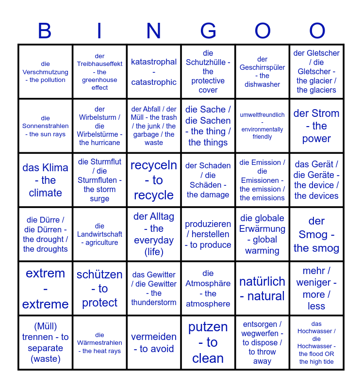 This bingo card has 48 words: Free!, das Klima - the climate, der Klimawandel - climate change, die globale Erwärmung - global warming, die Emission / die Emissionen - the emission / the emissions, die Atmosphäre - the atmosphere, der Treibhauseffekt - the greenhouse effect, das Treibhausgas / die Treibhausgase - the greenhouse gas, der Gletscher / die Gletscher - the glacier / the glaciers, die Wärmestrahlen - the heat rays, die Sonnenstrahlen - the sun rays, die Schutzhülle - the protective cover, die Landwirtschaft - agriculture, die Dürre / die Dürren - the drought / the droughts, das Hochwasser / die Hochwasser - the flood OR the high tide, das Gewitter / die Gewitter - the thunderstorm, der Wirbelsturm / die Wirbelstürme - the hurricane, die Sturmflut / die Sturmfluten - the storm surge, der Meeresspiegel - the sea level, der Geschirrspüler - the dishwasher, der Strom - the power, der Smog - the smog, die Verschmutzung - the pollution, der Abfall / der Müll - the trash / the junk / the garbage / the waste, die Verpackung / die Verpackungen - the packaging, die Sache / die Sachen - the thing / the things, der Alltag - the everyday (life), die Mülltonne / die Mülltonnen - the garbage can / the garbage cans, das Gerät / die Geräte - the device / the devices, der Schaden / die Schäden - the damage, verbrauchen - to consume / to use up, schützen - to protect, entsorgen / wegwerfen - to dispose / to throw away, schonen - to spare (to protect), produzieren / herstellen - to produce, vermeiden - to avoid, putzen - to clean, recyceln - to recycle, (Müll) trennen - to separate (waste), menschengemacht - man-made, natürlich - natural, extrem - extreme, katastrophal - catastrophic, elektrisch - electric, umweltfreundlich - environmentally friendly, umweltschädlich - harmful to the environment, mehr / weniger - more / less and elektrisch - electric.