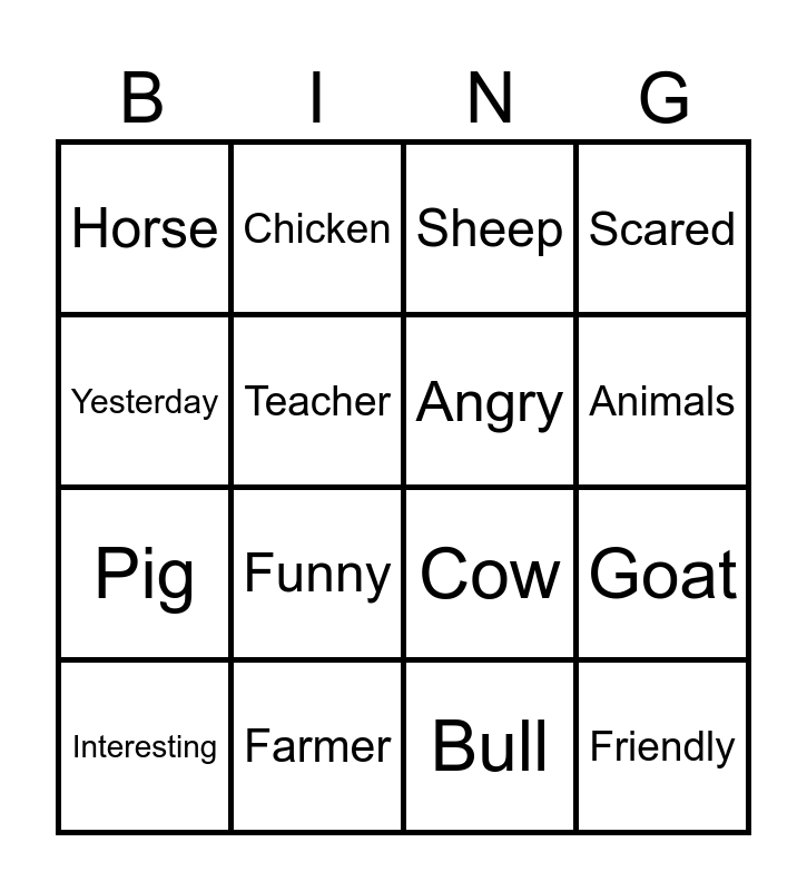 This bingo card has 16 words: Farmer, Goat, Sheep, Horse, Pig, Chicken, Cow, Bull, Yesterday, Teacher, Interesting, Scared, Funny, Animals, Angry and Friendly.