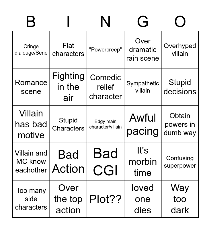 This bingo card has 25 words: Bad Action, Plot??, Comedic relief character, Too many side characters, Overhyped villain, Cringe dialouge/Sene, Romance scene, Flat characters, Awful pacing, Bad CGI, Sympathetic villain, Villain has bad motive, It's morbin time, Confusing superpower, Fighting in the air, Way too dark, Obtain powers in dumb way, "Powercreep", Stupid decisions, Stupid Characters, Edgy main character/villain, Over the top action, Villain and MC know eachother, Over dramatic rain scene and loved one dies.