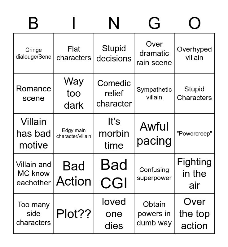 This bingo card has a free space and 24 words: Bad Action, Plot??, Comedic relief character, Too many side characters, Overhyped villain, Cringe dialouge/Sene, Romance scene, Flat characters, Awful pacing, Bad CGI, Sympathetic villain, Villain has bad motive, Confusing superpower, Fighting in the air, Way too dark, Obtain powers in dumb way, "Powercreep", Stupid decisions, Stupid Characters, Edgy main character/villain, Over the top action, Villain and MC know eachother, Over dramatic rain scene and loved one dies.