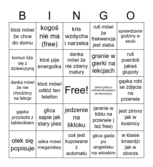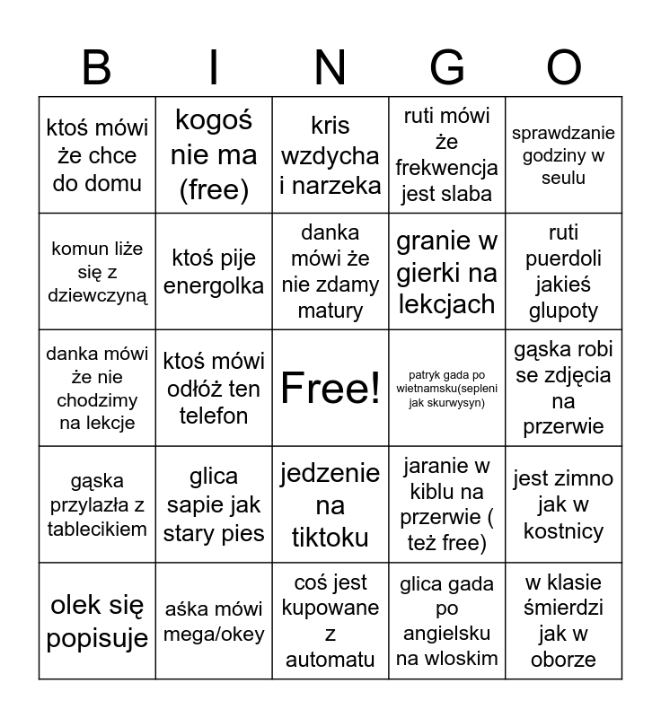 This bingo card has a free space and 24 words: glica sapie jak stary pies, aśka mówi mega/okey, danka mówi że nie zdamy matury, olek się popisuje, sprawdzanie godziny w seulu, ktoś mówi że chce do domu, komun liże się z dziewczyną, kogoś nie ma (free), patryk gada po wietnamsku(sepleni jak skurwysyn), jedzenie na tiktoku, granie w gierki na lekcjach, danka mówi że nie chodzimy na lekcje, jaranie w kiblu na przerwie ( też free), jest zimno jak w kostnicy, ktoś pije energolka, glica gada po angielsku na wloskim, gąska robi se zdjęcia na przerwie, kris wzdycha i narzeka, ruti puerdoli jakieś glupoty, ktoś mówi odłóż ten telefon, w klasie śmierdzi jak w oborze, gąska przylazła z tablecikiem, ruti mówi że frekwencja jest slaba and coś jest kupowane z automatu.