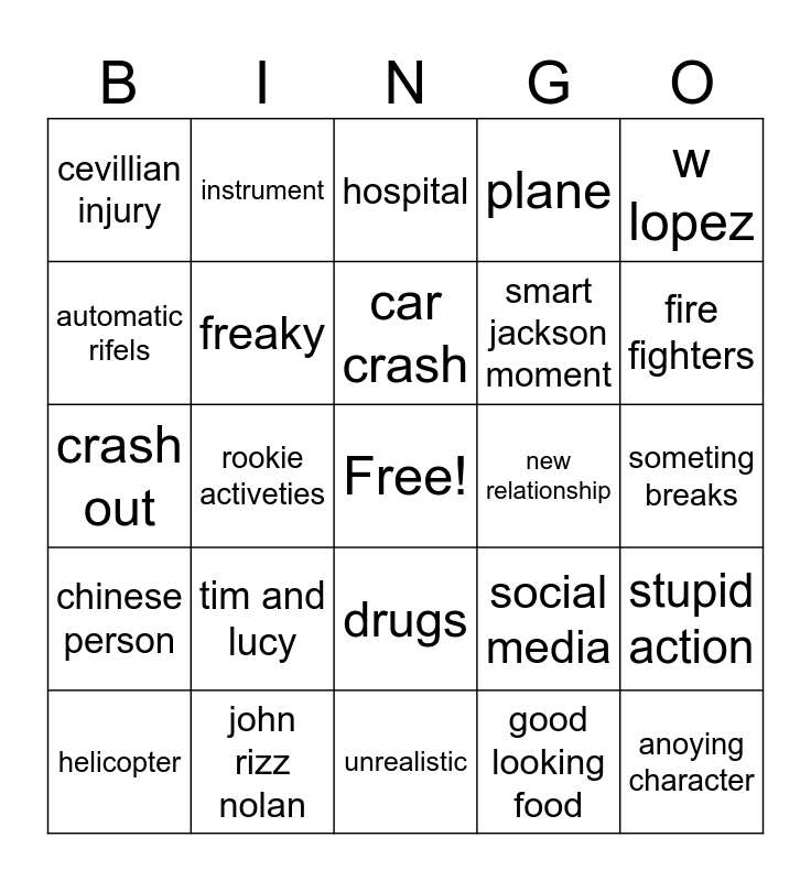 This bingo card has a free space and 24 words: tim and lucy, john rizz nolan, car crash, helicopter, w lopez, cevillian injury, automatic rifels, instrument, new relationship, drugs, smart jackson moment, crash out, social media, stupid action, freaky, good looking food, someting breaks, hospital, fire fighters, rookie activeties, anoying character, chinese person, plane and unrealistic.