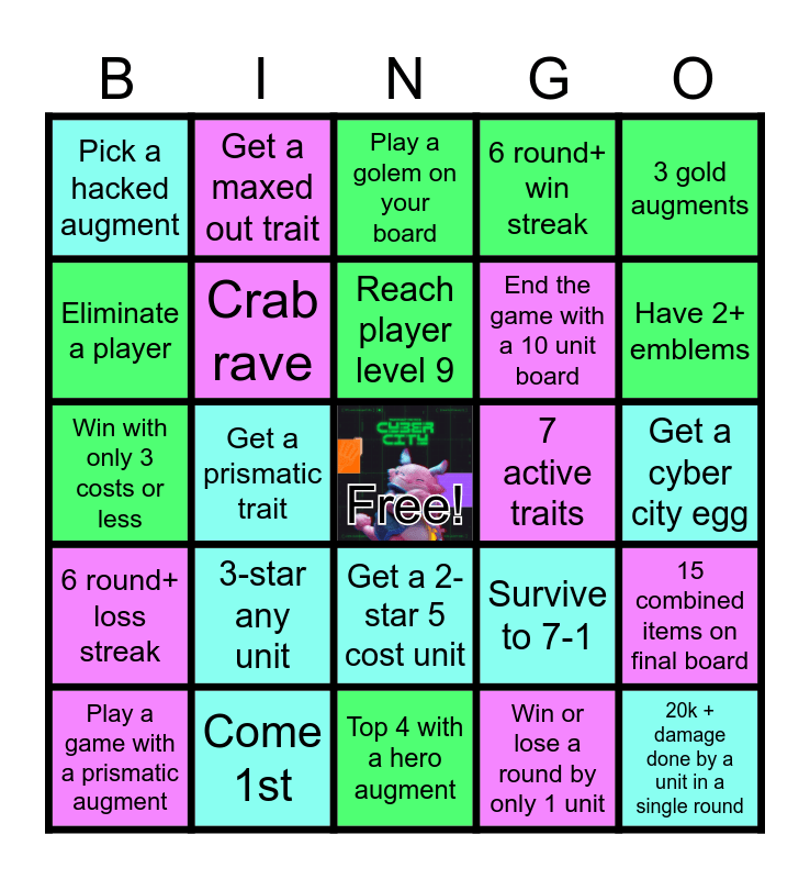 This bingo card has a free space and 24 words: 3-star any unit, Come 1st, Reach player level 9, Play a game with a prismatic augment, 3 gold augments, Pick a hacked augment, Eliminate a player, Get a maxed out trait, 7 active traits, Get a 2-star 5 cost unit, End the game with a 10 unit board, Win with only 3 costs or less, Survive to 7-1, 15 combined items on final board, Crab rave, Win or lose a round by only 1 unit, Get a cyber city egg, Play a golem on your board, Have 2+ emblems, Get a prismatic trait, 20k + damage done by a unit in a single round, 6 round+ loss streak, 6 round+ win streak and Top 4 with a hero augment.