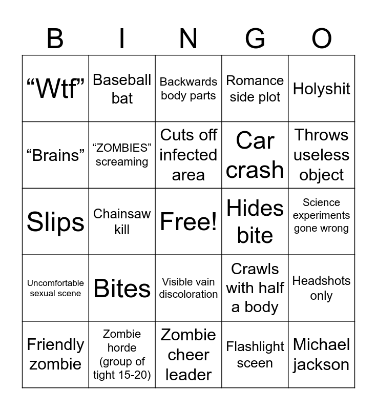 This bingo card has a free space and 24 words: Friendly zombie, Bites, Cuts off infected area, Flashlight sceen, Holyshit, “Wtf”, Baseball bat, Backwards body parts, Hides bite, Science experiments gone wrong, Slips, “ZOMBIES” screaming, Crawls with half a body, Headshots only, “Brains”, Zombie horde (group of tight 15-20), Zombie cheer leader, Romance side plot, Throws useless object, Uncomfortable sexual scene, Chainsaw kill, Visible vain discoloration, Car crash and Michael jackson.