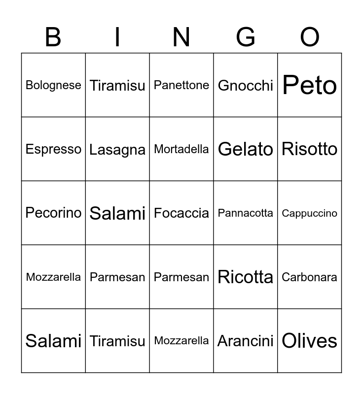 This bingo card has 52 words: Pasta, Focaccia, Olives, Mozzarella, Parmesan, Prosciutto, Tiramisu, Gnocchi, Espresso, Pizza, Lasagna, Free!, Carbonara, Ricotta, Risotto, Cannoli, Mortadella, Pannacotta, Eggplant, Peto, Salami, Arancini, Bolognese, Gelato, Truffle, Olives, Bread, Pasta, Risotto, Pizza, Lasagna, Gnocchi, Focaccia, Bruschetta, Arancini, Panettone, Tiramisu, Cannoli, Pannacotta, Gelato, Espresso, Cappuccino, Mozzarella, Carbonara, Parmesan, Ricotta, Pesto, Pecorino, Prosciutto, Mortadella, Salami and Bolognese.