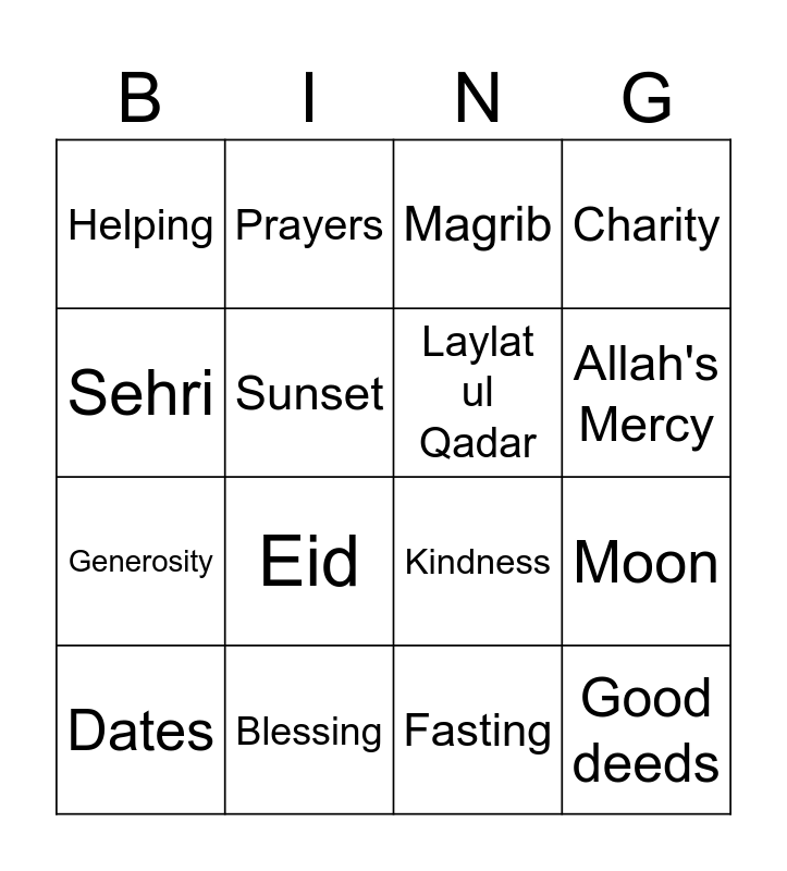 This bingo card has 20 words: Dates, Fajar, Magrib, Moon, Quran, Eid, Fasting, Charity, Generosity, Prayers, Kindness, Allah's Mercy, Helping, Blessing, Laylat ul Qadar, Iftar, Sehri, Sunset, Dawn and Good deeds.