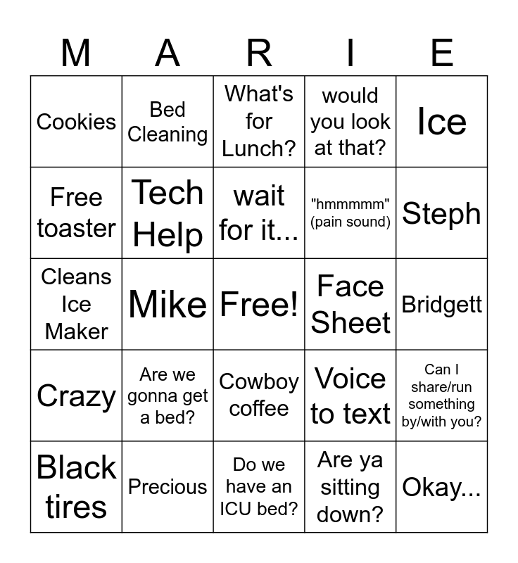 This bingo card has a free space and 24 words: Black tires, Are we gonna get a bed?, wait for it..., Are ya sitting down?, Ice, Cookies, Bed Cleaning, What's for Lunch?, Face Sheet, Bridgett, Cleans Ice Maker, Tech Help, Voice to text, Can I share/run something by/with you?, Free toaster, Precious, Do we have an ICU bed?, would you look at that?, Steph, Crazy, Mike, Cowboy coffee, "hmmmmm" (pain sound) and Okay....