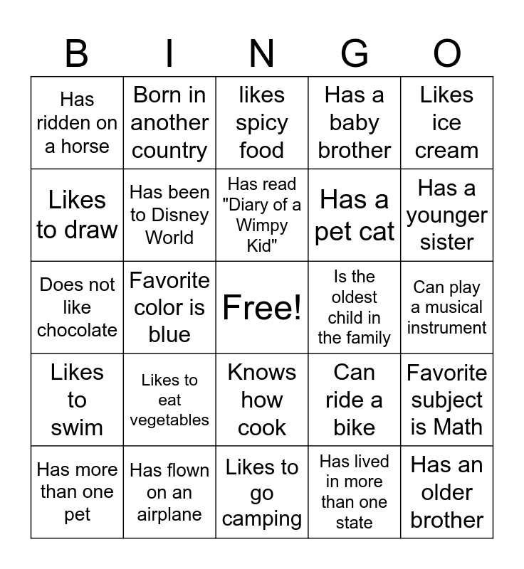 This bingo card has a free space and 24 words: Likes to eat vegetables, Has flown on an airplane, Has read "Diary of a Wimpy Kid", Has more than one pet, Likes ice cream, Has ridden on a horse, Likes to draw, Born in another country, Is the oldest child in the family, Knows how cook, Has a pet cat, Does not like chocolate, Can ride a bike, Favorite subject is Math, Has been to Disney World, Has lived in more than one state, Can play a musical instrument, likes spicy food, Has a younger sister, Favorite color is blue, Has an older brother, Likes to swim, Has a baby brother and Likes to go camping.