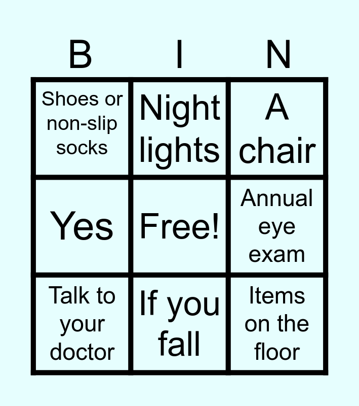 This bingo card has a free space and 11 words: Supportive devices; Walkers or canes, Rugs or carpets, Annual eye exam, Talk to your doctor, A chair, Shoes or non-slip socks, If you fall, Home safety checklist, Yes, Night lights and Items on the floor.