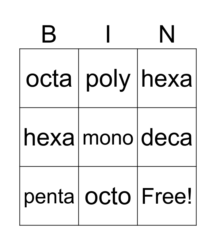 This bingo card has 16 words: deca, penta, hexa, octa, Free!, poly, tri, tetra, mono, deca, poly, hexa, di, octo, penta and tri.