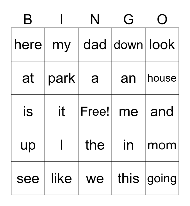 This bingo card has a free space and 24 words: I, like, a, see, look, here, at, my, me, the, an, is, in, mom, park, this, and, dad, house, it, going, up, down and we.