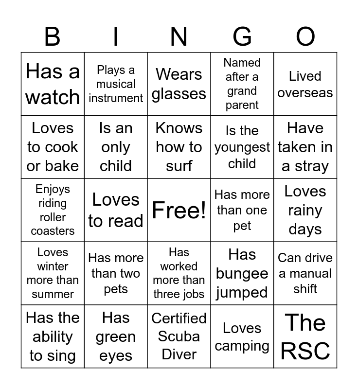 This bingo card has a free space and 84 words: Can play an instrument, Has a birthday this month!, Wears glasses, was in Africa, knows 5 languages, Has traveled outside the country, Loves to sing Karaoke, Loves to draw or paint, Had one healthy food item for breakfast, Plays video games, Has lived in another country, Is Left-handed, Is an only child, Has more than one pet, Has broken a bone, Has a watch, Has the ability to sing, Loves to cook or bake, Has never seen a Harry Potter movie, Dislikes chocolate, Is the oldest child, Is the youngest child, The RSC, Favorite color is blue, Loves to read, Loves to dance, Was born in another country, Climbed a mountain, Has never seen a Star Wars Film, Can speak more than one language, Has more than two pets, Has no facebook account, Has been snorkeling, Enjoys riding roller coasters, Prefers tea over coffee, Has walked/run a race, Certified Scuba Diver, Regularly Volunteers, Have taken in a stray, Loves winter more than summer, Never uses the snooze button, Has a garden, Was part of a talk show audience, Watches reality TV, Has taken a selfie with a celebrity, Has been snowboarding, Plays a musical instrument, Been sky diving, Has an aquarium, Knows a magic trick, Prefers snow vacation, Has bungee jumped, Named after a grand parent, Loves theme parks, Have a pet other than a cat or dog, Met someone famous, Has green eyes, Knows how to surf, Likes spicy food, Loves rainy days, Shares a name with an ancestor, Doesn’t like chocolate, Has flown in a helicopter, Prefers books to ebooks, Has a celebrity autograph, Loves trying new foods, Likes to get up early, Rode a horse, Lived overseas, Served in the military, Can drive a manual shift, Prefers a truck over a car, Has been to a tropical island, Has siblings, Has worked more than three jobs, Loves camping, Team EWIS, Team FMCI, Team IAT, Team NRE, Team SI, Team STAA, Team CPIO and Team Field Ops.