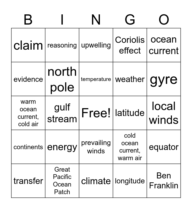 This bingo card has a free space and 25 words: energy, climate, temperature, transfer, ocean current, claim, evidence, reasoning, latitude, prevailing winds, weather, warm ocean current, cold air, cold ocean current, warm air, equator, north pole, south pole, local winds, upwelling, gyre, gulf stream, Ben Franklin, Great Pacific Ocean Patch, continents, Coriolis effect and longitude.