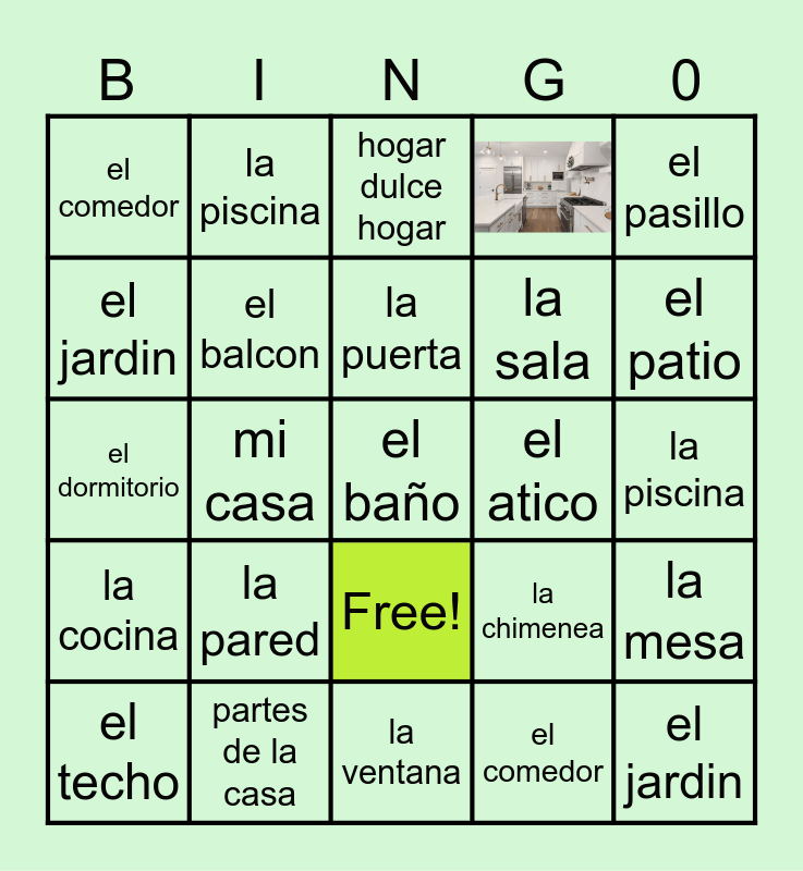 This bingo card has 2 images and 33 words: mi casa es tu casa, el dormitorio, cuarto, la sala, el jardin, el comedor, el balcon, la casa, el atico, la escalera, el dormitorio, la piscina, Free!, la escalera, el pasillo, la cocina, partes de la casa, hogar dulce hogar, el comedor, la piscina, el techo, mi casa, el baño, el garaje, el patio, el jardin, el sotano, la ventana, la chimenea, la mesa, el piso, la pared and la puerta.