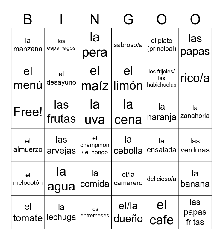 This bingo card has 36 words: el/la camarero, la comida, el/la dueño, el menú, el almuerzo, la cena, el desayuno, los entremeses, el plato (principal), delicioso/a, rico/a, sabroso/a, la banana, las frutas, el limón, la manzana, el melocotón, la naranja, Free!, la pera, la uva, las arvejas, la cebolla, el champiñón / el hongo, la ensalada, los espárragos, los frijoles/ las habichuelas, la lechuga, el maíz, las papas, las papas fritas, el tomate, las verduras, la zanahoria, la agua and el cafe.